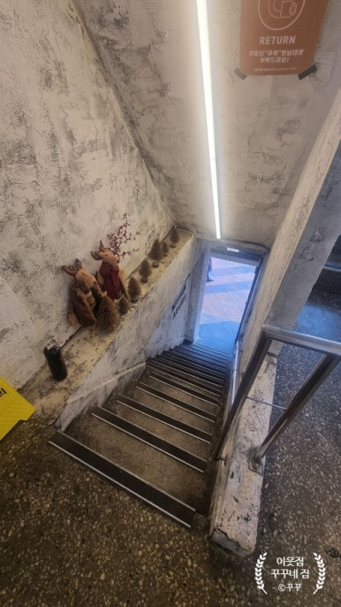 간만에 멋부린다고 부츠를 신고 나왔더니 세상 힘드네요~ 어서 메뉴 고르고 앉고 싶은맘이 컸어요. 우측에는 무심한듯 세상 힙한 회벽색의 멋스러운 계단이 있더라구요. 그렇습니다. 주문한 후 빵이랑 음료 받아서 2.3층 매장에서 드시거나 포장해서 가실 수 있는 시스템입니다.
