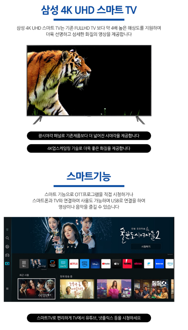 BU8000은 스마트 기능도 충실히 갖추고 있어 넷플릭스, 유튜브 등 OTT 서비스에 쉽게 접근할 수 있습니다. 게다가 슬림한 베젤 디자인과 얇은 두께는 TV를 더욱 세련되게 보이게 해 줍니다. 가격대는 200만 원 이하로 구매가 가능하며, 기본에 충실하면서도 고급스러운 사용 경험을 제공합니다.