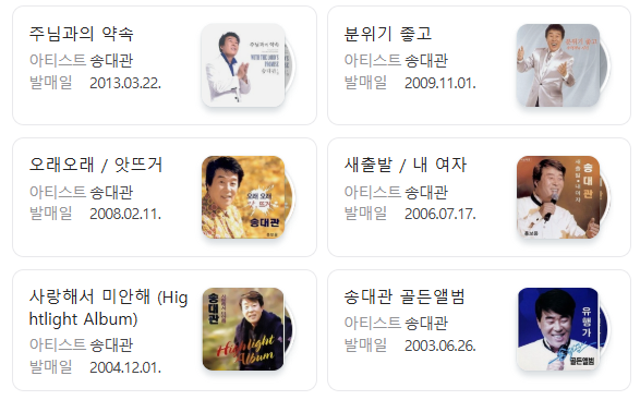 송대관의 음악 경력에서 가장 빼놓을 수 없는 것은 그의 히트곡들입니다. '사랑의 트위스트', '당신은 나의 사랑', '아파트' 등은 그의 대표적인 곡으로, 각 곡은 트로트의 매력을 잘 담고 있습니다. 특히 '사랑의 트위스트'는 송대관의 초기 히트곡 중 하나로, 그가 널리 알려지게 된 계기가 되었습니다. 또한 그는 여러 음반을 발매하며, 다양한 장르의 곡을 시도했지만, 항상 트로트의 본질을 잃지 않았습니다. 그의 음악은 단순한 오락을 넘어 사람들의 마음을 울리는 감동적인 메시지를 담고 있습니다.