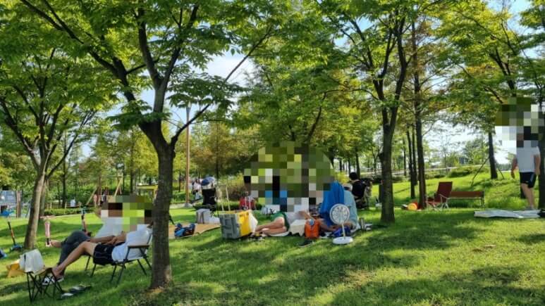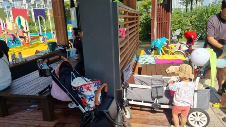 아이들 귀엽게 킥보드랑 유모차 파킹해두고 돗자리 폈네요.