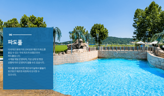 06 파도풀 이국적인 분위기의 신비로운 해안가 파도를 즐길 수 있는 국내 최초의 유황온천수 파도풀입니다. 사계절 매일 운영되며, 기상 상태 및 현장 상황에 따라 운영되지 않을 수도 있습니다. 파도풀 옆에 위치한 체온유지실에서 물놀이 중간중간 체온을 따듯하게 유지할 수 있습니다.