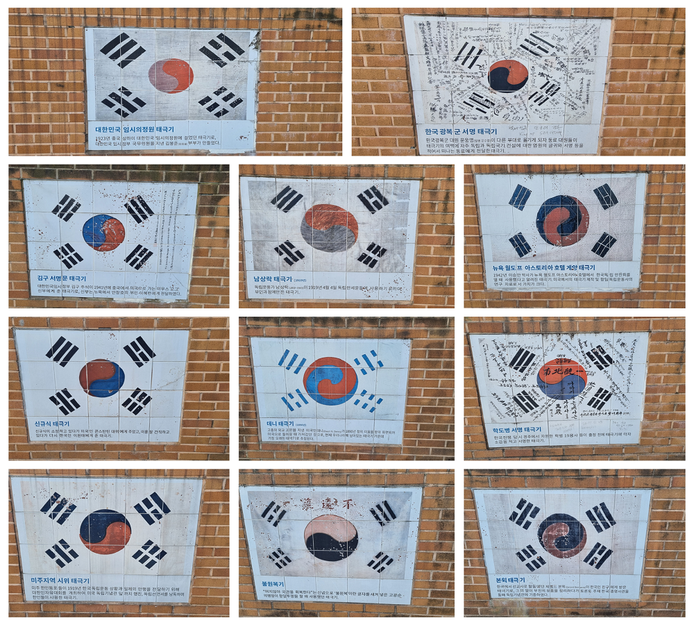 그런데 저희가 아는 일반적인 태극기와 다른 모습이 담장에 새겨 있더라고요.