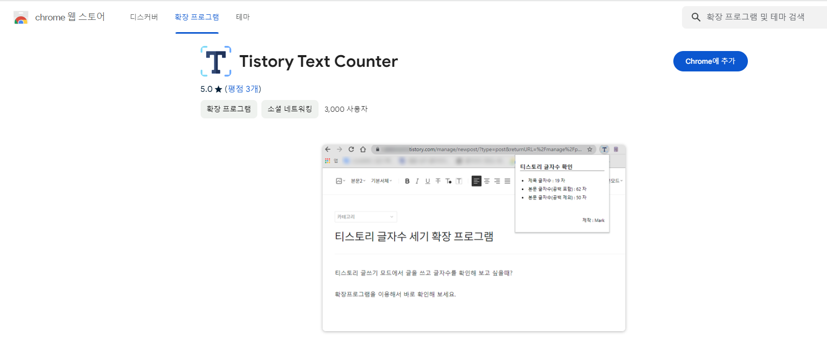 티스토리 글쓰기 모드에서 현재 작성한 글자수와 키워드 수를 바로 확인할 수 있는 확장 프로그램이다.