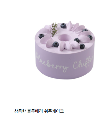 상큼한 블루베리 쉬폰케이크는 향긋한 블루베리 시트와 상큼한 블루베리 콤포트가 어우러진 쉬폰 케이크로, 가격은 약 33,000원입니다.
